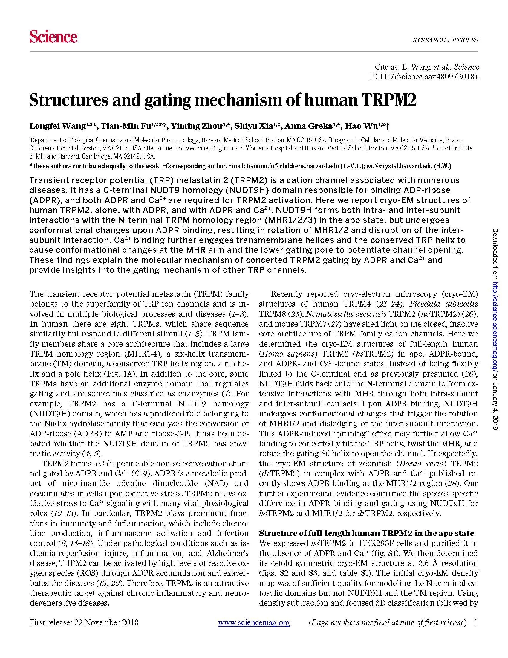 Wang L, Fu TM, Zhou Y, Xia S, Greka A, Wu H. Structures and gating mechanism of human TRPM2. Science. 2018 Dec 21;362(6421):eaav4809. doi: 10.1126/science.aav4809. Epub 2018 Nov 22. PMID: 30467180; PMCID: PMC6459600.