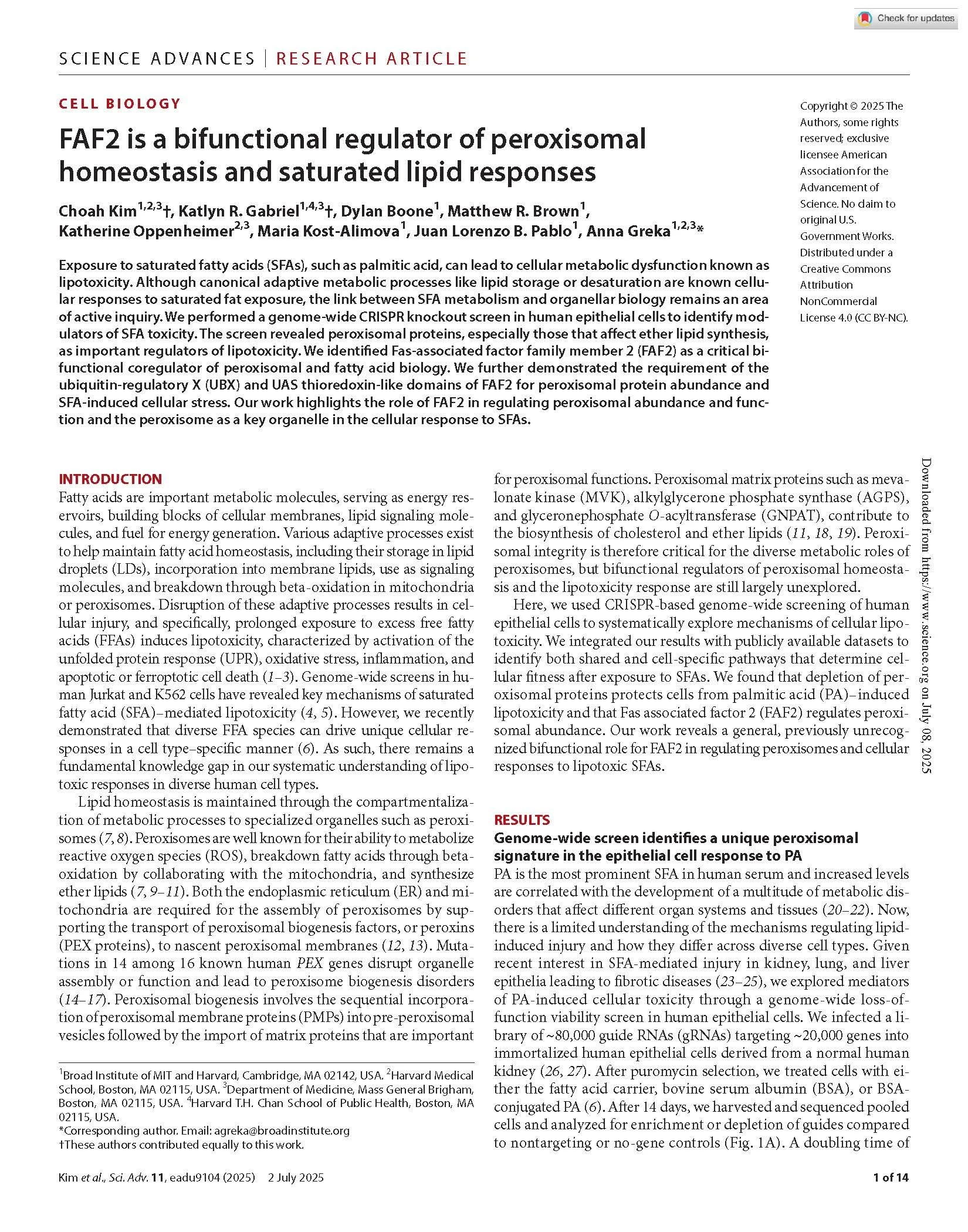 Kim C, Gabriel KR, Boone D, Brown MR, Oppenheimer K, Kost-Alimova M, Pablo JLB, Greka A. FAF2 is a bifunctional regulator of peroxisomal homeostasis and saturated lipid responses. Sci Adv. 2025 Jul 4;11(27):eadu9104. doi: 10.1126/sciadv.adu9104. Epub 2025 Jul 2. PMID: 40601736; PMCID: PMC12219479.