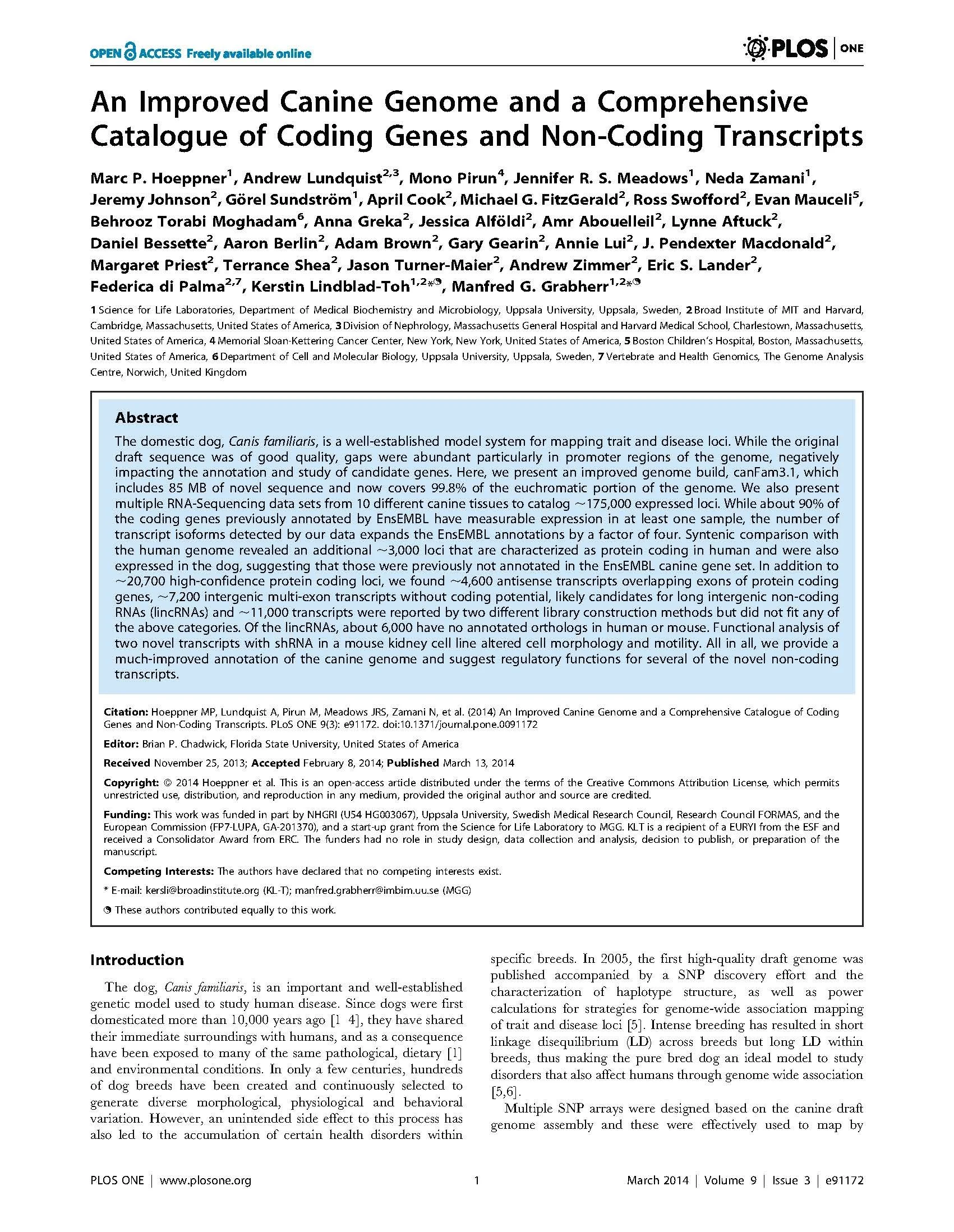 Hoeppner MP, Lundquist A, Pirun M, Meadows JR, Zamani N, Johnson J, Sundström G, Cook A, FitzGerald MG, Swofford R, Mauceli E, Moghadam BT, Greka A, Alföldi J, Abouelleil A, Aftuck L, Bessette D, Berlin A, Brown A, Gearin G, Lui A, Macdonald JP, Priest M, Shea T, Turner-Maier J, Zimmer A, Lander ES, di Palma F, Lindblad-Toh K, Grabherr MG. An improved canine genome and a comprehensive catalogue of coding genes and non-coding transcripts. PLoS One. 2014 Mar 13;9(3):e91172. doi: 10.1371/journal.pone.0091172. PMID: 24625832; PMCID: PMC3953330.