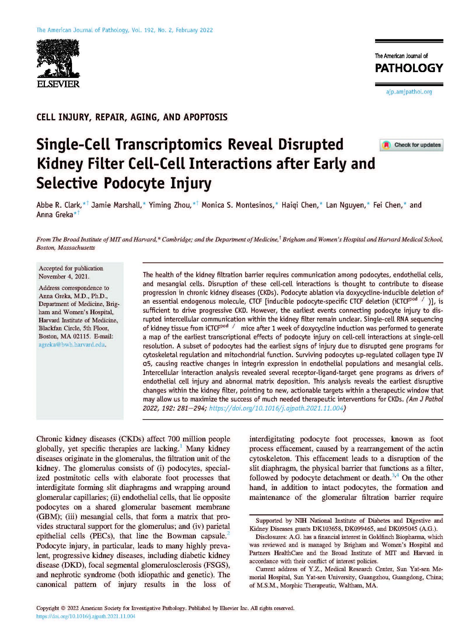 Clark AR, Marshall J, Zhou Y, Montesinos MS, Chen H, Nguyen L, Chen F, Greka A. Single-Cell Transcriptomics Reveal Disrupted Kidney Filter Cell-Cell Interactions after Early and Selective Podocyte Injury. Am J Pathol. 2021 Nov 30:S0002-9440(21)00513-7. doi: 10.1016/j.ajpath.2021.11.004. Epub ahead of print. PMID: 34861215.