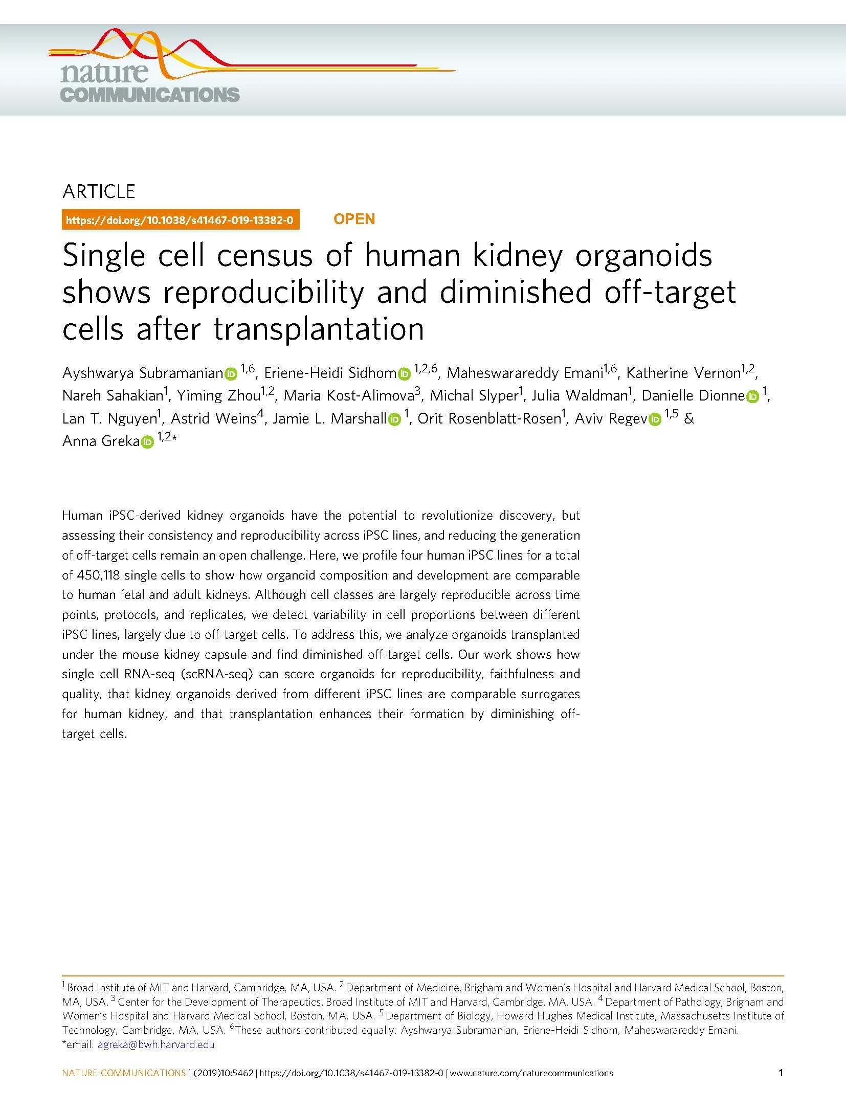 Subramanian A, Sidhom EH, Emani M, Vernon K, Sahakian N, Zhou Y, Kost-Alimova M, Slyper M, Waldman J, Dionne D, Nguyen LT, Weins A, Marshall JL, Rosenblatt-Rosen O, Regev A, Greka A. Single cell census of human kidney organoids shows reproducibility and diminished off-target cells after transplantation. Nat Commun. 2019 Nov 29;10(1):5462. doi: 10.1038/s41467-019-13382-0. PMID: 31784515; PMCID: PMC6884507.