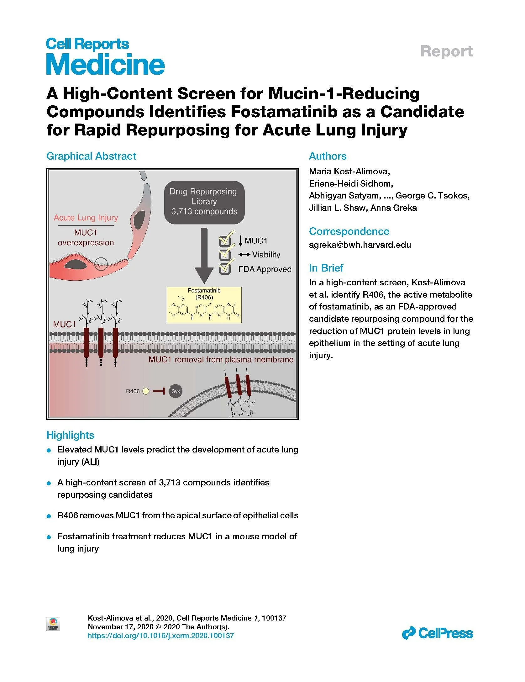 Kost-Alimova M, Sidhom EH, Satyam A, Chamberlain BT, Dvela-Levitt M, Melanson M, Alper SL, Santos J, Gutierrez J, Subramanian A, Byrne PJ, Grinkevich E, Reyes-Bricio E, Kim C, Clark AR, Watts AJB, Thompson R, Marshall J, Pablo JL, Coraor J, Roignot J, Vernon KA, Keller K, Campbell A, Emani M, Racette M, Bazua-Valenti S, Padovano V, Weins A, McAdoo SP, Tam FWK, Ronco L, Wagner F, Tsokos GC, Shaw JL, Greka A. A High-Content Screen for Mucin-1-Reducing Compounds Identifies Fostamatinib as a Candidate for Rapid Repurposing for Acute Lung Injury. Cell Rep Med. 2020 Oct 29;1(8):100137. doi: 10.1016/j.xcrm.2020.100137. PMID: 33294858; PMCID: PMC7691435.