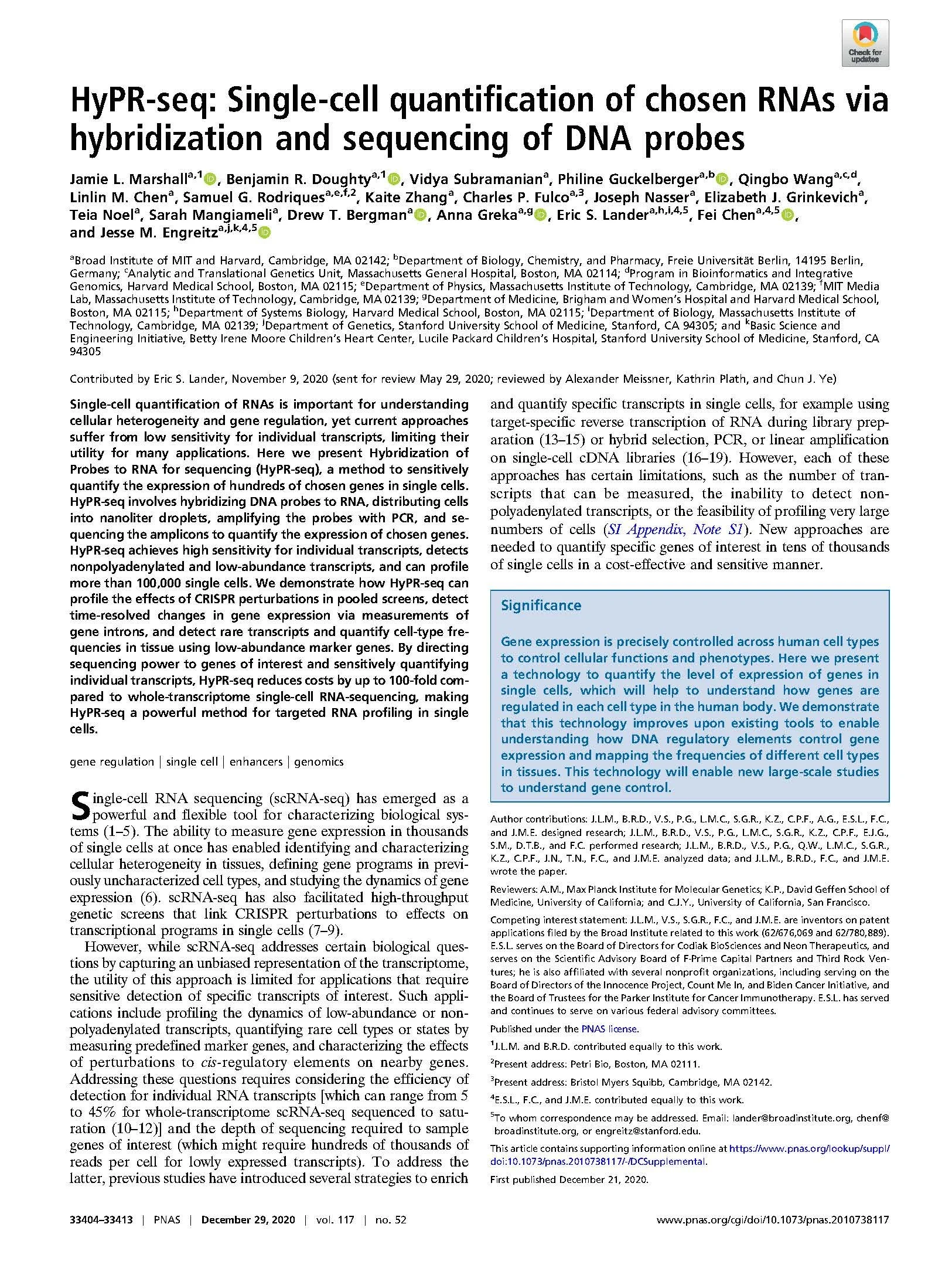 Marshall JL, Doughty BR, Subramanian V, Guckelberger P, Wang Q, Chen LM, Rodriques SG, Zhang K, Fulco CP, Nasser J, Grinkevich EJ, Noel T, Mangiameli S, Bergman DT, Greka A, Lander ES, Chen F, Engreitz JM. HyPR-seq: Single-cell quantification of chosen RNAs via hybridization and sequencing of DNA probes. Proc Natl Acad Sci U S A. 2020 Dec 29;117(52):33404-33413. doi: 10.1073/pnas.2010738117. Epub 2020 Dec 21. PMID: 33376219; PMCID: PMC7776864.