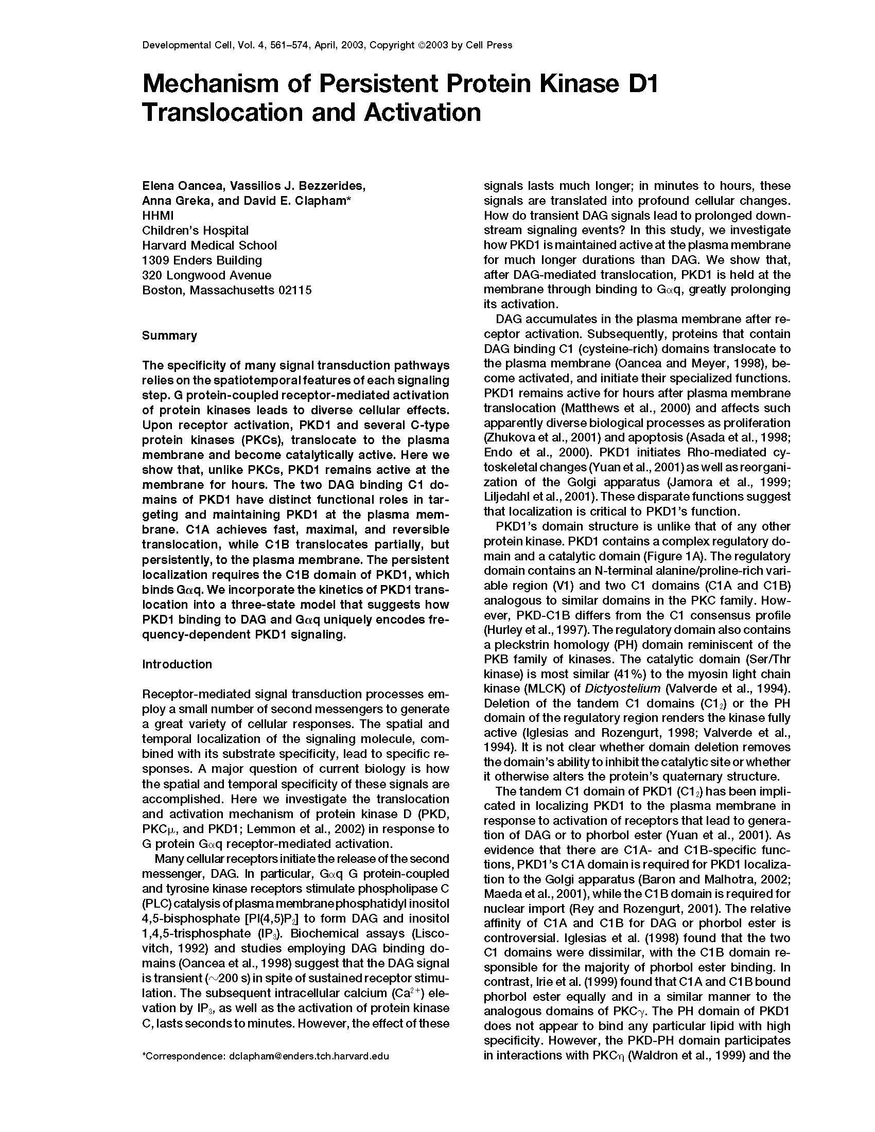 Oancea E, Bezzerides VJ, Greka A, Clapham DE. Mechanism of persistent protein kinase D1 translocation and activation. Dev Cell. 2003 Apr;4(4):561-74. doi: 10.1016/s1534-5807(03)00087-x. PMID: 12689594.